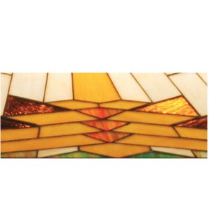 Warm earth toned Bone Beige and Moccasin Tan stained glass, accented with glistening Root Brown and Sage Green, is used to make this intricate interlocking patterned shade. Mission style hardware in a hand applied Mahogany Bronze finish supports the handsome rectangular shade inspired by historic American artwork. Handcrafted with the copper foil technique developed by Louis Comfort Tiffany, this oblong pendant fixture is a true masterpiece.