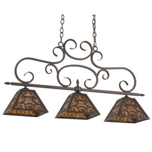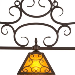 An exquisite oblong pendant features three stunning Amber Mica shades which are accentuated with elegant, fanciful scroll designs and crowned with matching scroll styled metalwork. The frame, decorative accents and hardware are featured in a Mahogany Bronze finish. This oblong pendant is ideal for illuminating dining tables, billiard rooms, reception areas, islands, counters and other fine interiors. Custom crafted at our manufacturing facility in the USA, Bandolei is available in custom sizes, styles and colors, as well as dimmable energy efficient lamping options such as LED. The fixture is UL and cUL listed for damp and dry locations.