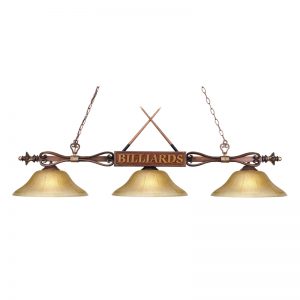 - 59.5″ Designer Classics 3 Light LED Billiard In Wood Patina And Amber Gratina Glass