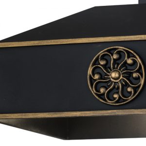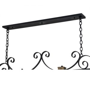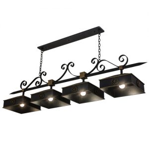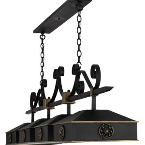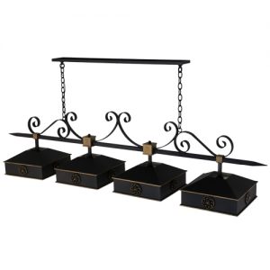 Sophisticated refinement is unveiled with a handsome lighting design statement. Four distinctive shades are featured in a Blackwash finish with Gold accents, and suspended from a scroll designed suspension. This pendant is ideal for illuminating billiard tables,islands, counters, bars and other tabletops. Custom options are available, including designs, colors, sizes and dimmable energy efficient lamping. The fixture is UL and cUL listed for damp and dry locations.
